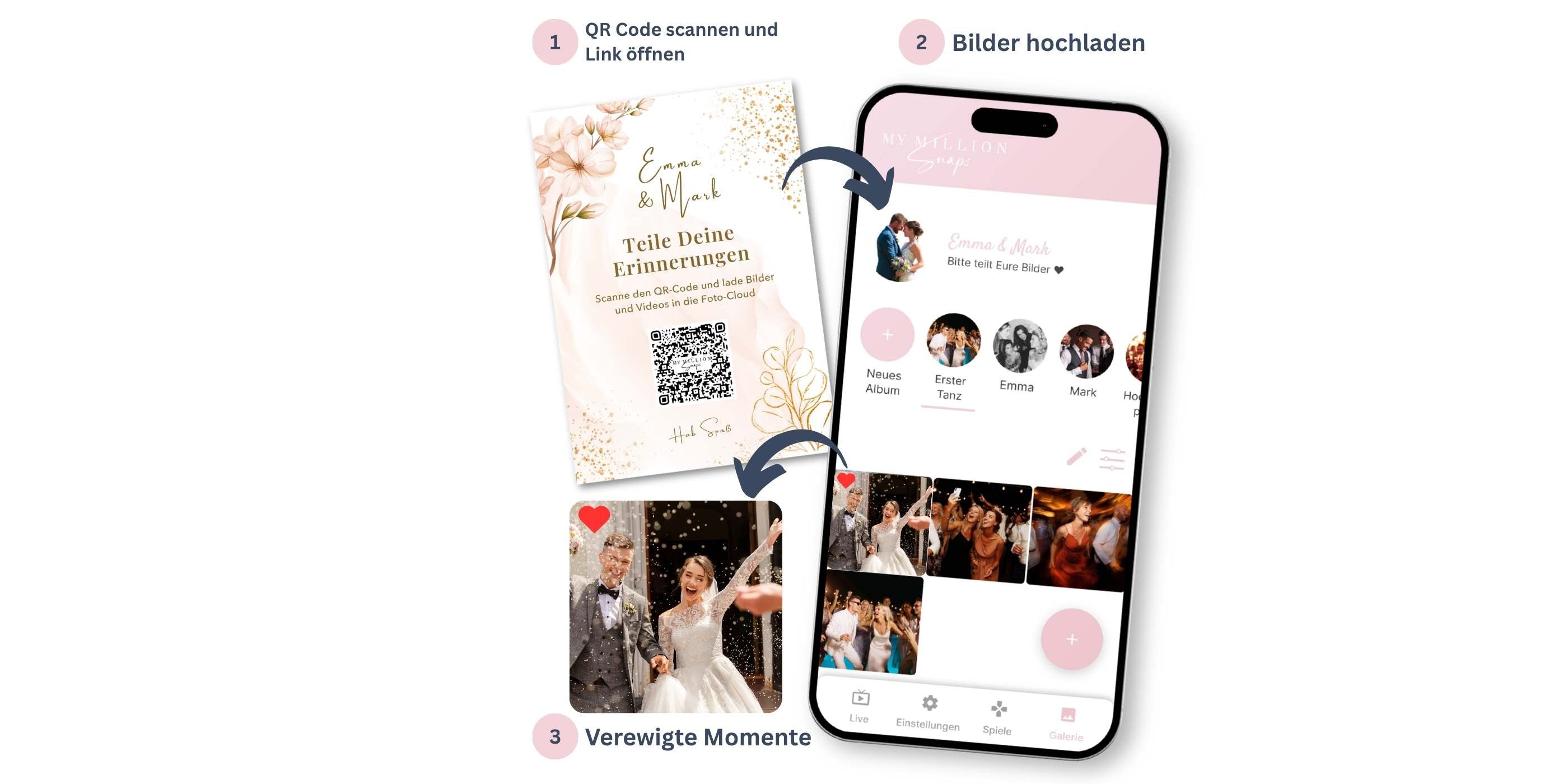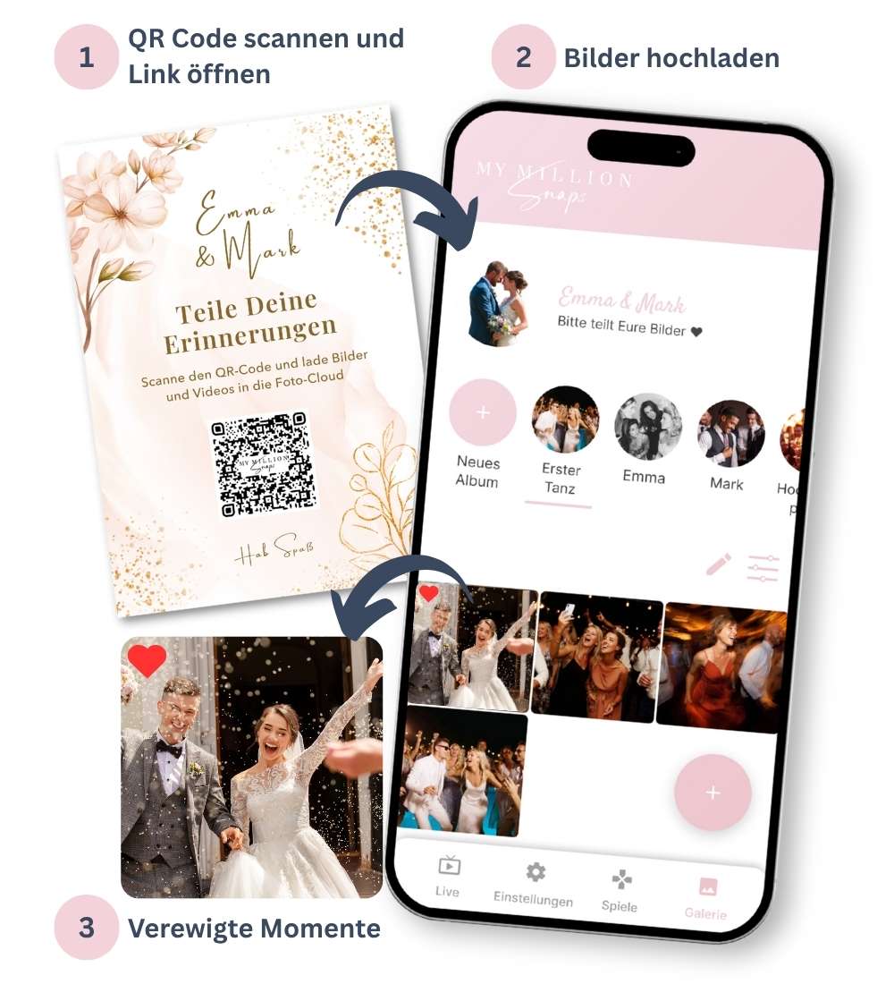 Gäste scannen den QR-Code oder klicken den Link und laden ihre Bilder direkt in deine Hochzeitsgalerie